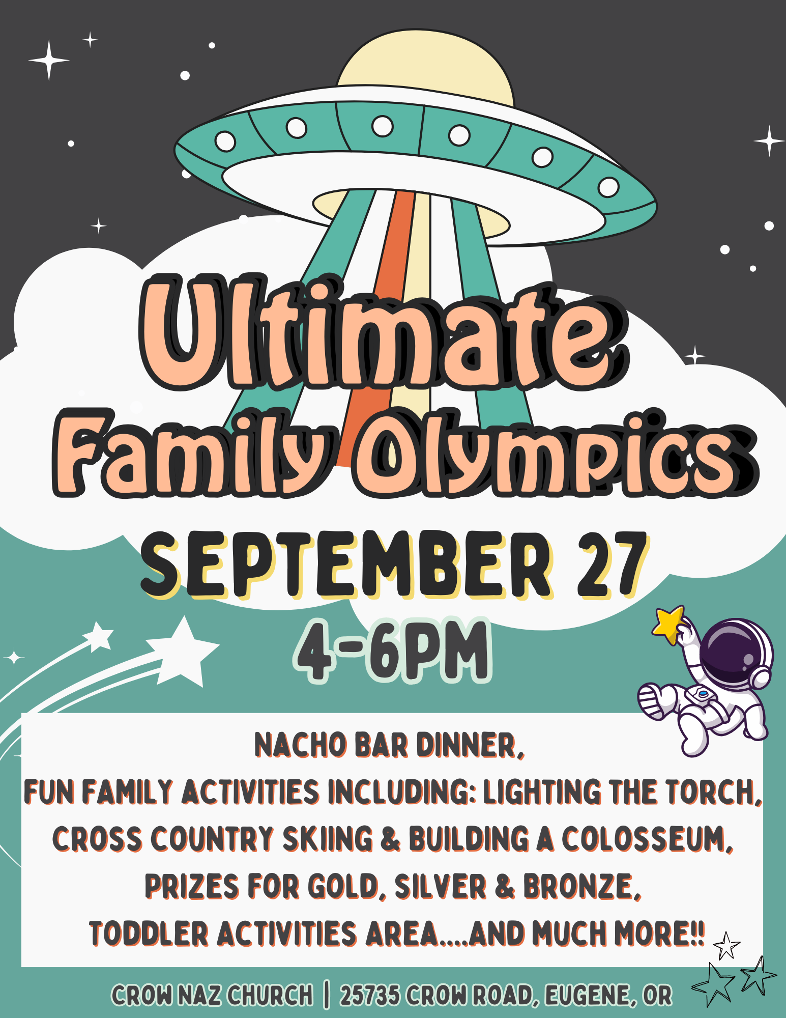 Sign up below to register your family for UFO: Ultimate Family Olympics for an evening full of games and fun! A nacho bar dinner will be provided! For families with kids and teens of ALL ages!